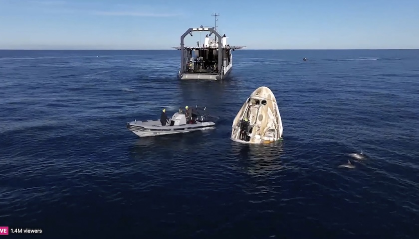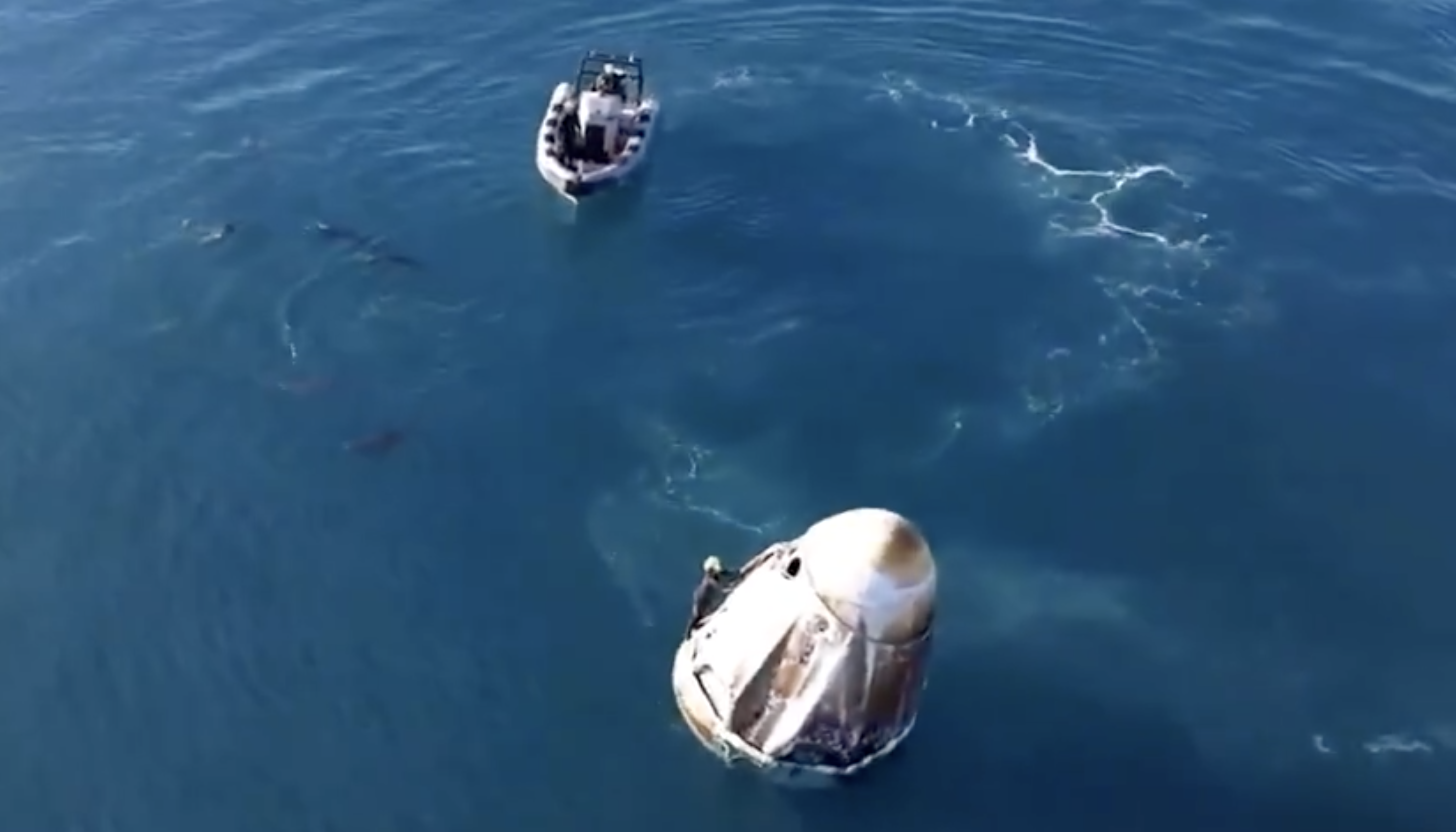 等候多时的载回船和直升机迅速抵达溅落位置,协助宇航员出舱并进行初步的身体检查。同时,这一行动也吸引到一群“好奇的”海豚在周围绕圈围观。