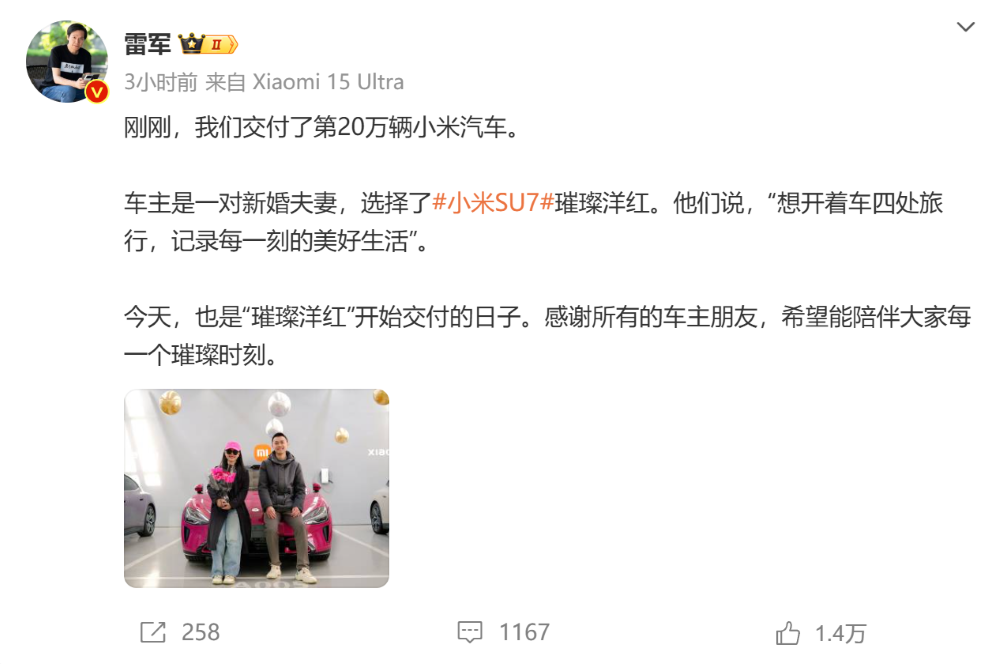 ▲雷军发文表示第20万辆小米汽车已经正式交付
