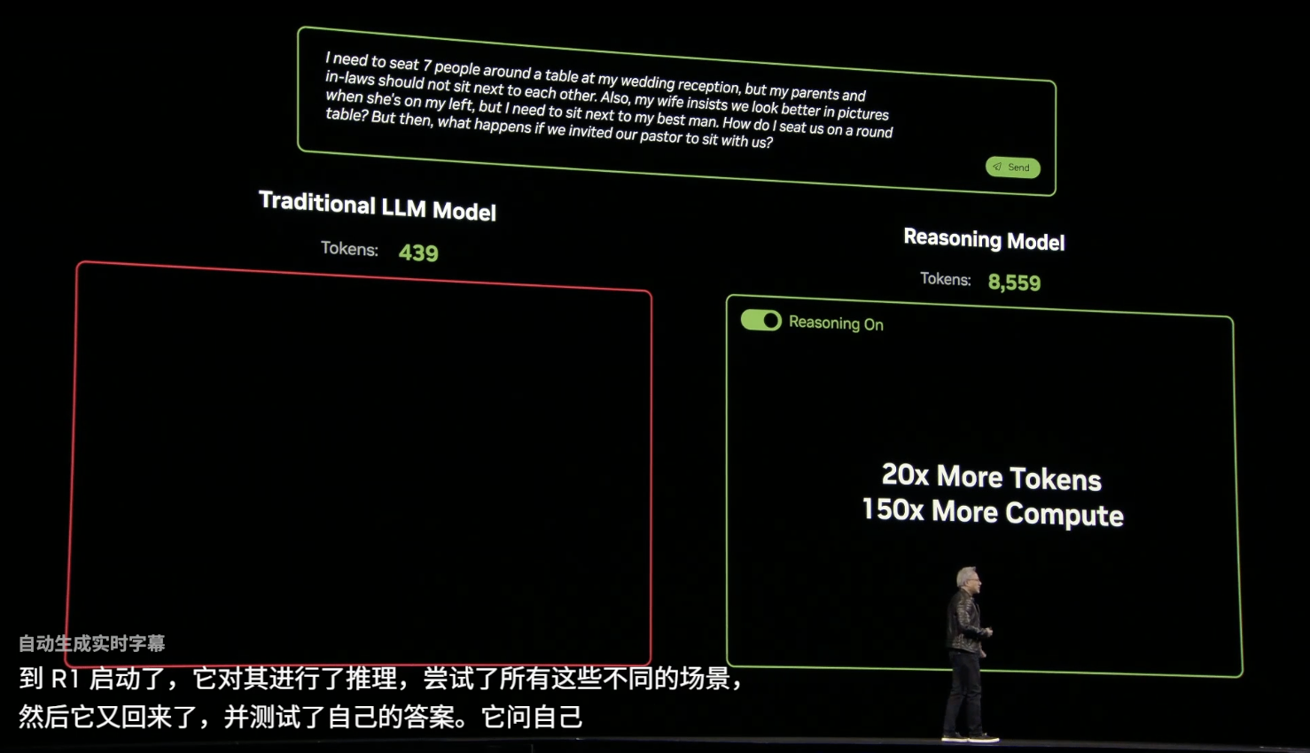 GTC 2025上,黄仁勋仍然看好推理AI,巧妙地选择用长思维链(CoT)推理需要消耗的tokens来做比较。他向传统大语言模型(LLM)和推理模型提出了同一个问题:300人的婚礼上如何安排座位。LLM消耗439 tokens快速得出了一个错误答案,而推理模型消耗8559 tokens,经过较长时间的思考得出了一个得体的答案。