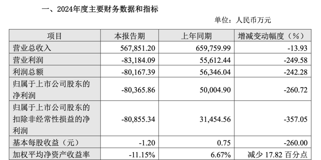 3月17日晚间,上海家化发布了2024年度业绩快报公告。根据公告,期内,上海家化营业总收入录得56.79亿元,同比下降13.93%;营业利润录得-8.32亿元,同比下滑249.58%;归属于上市公司股东的净利润为-8.04亿元,同比暴跌260.72%。