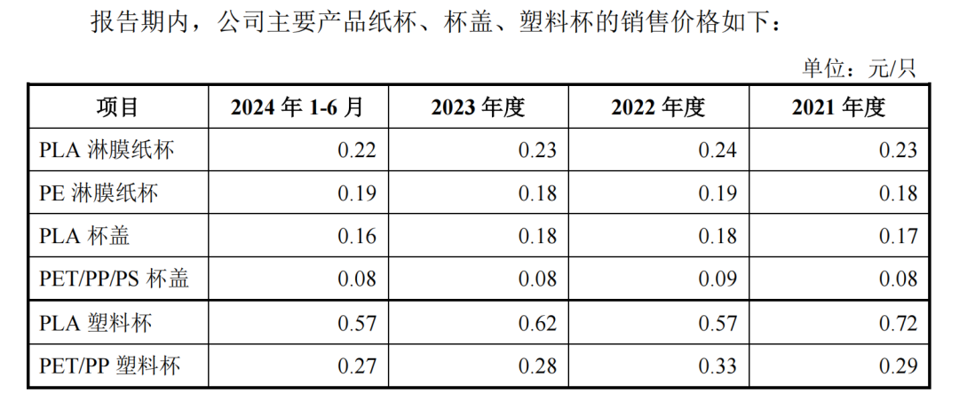 如下图所示,恒鑫生活主要产品纸杯、杯盖、塑料杯的销售价格均不超过一元,按最新的2024年1-6月信息来看,恒鑫生活生产的纸杯PLA淋膜纸杯、PE淋膜纸杯的销售价格分别为0.22元、0.19元;塑料杯PLA塑料杯、PET/PP塑料杯的销售价格分别为0.57元、0.27元;PLA杯盖和PET/PP/PS杯盖的价格分别为0.16元和0.08元。