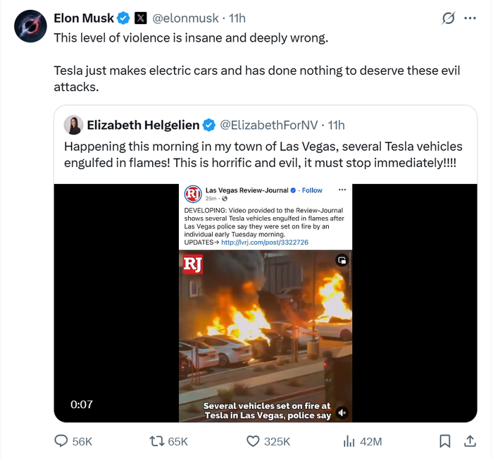 当地时间3月18日,美国拉斯维加斯发生特斯拉汽车遭纵火事件,特斯拉CEO埃隆·马斯克在社交平台上发文称,“这种程度的暴力行为疯狂且极其错误。特斯拉只是生产电动汽车,并没有做任何应该遭到这种邪恶袭击的事情。”