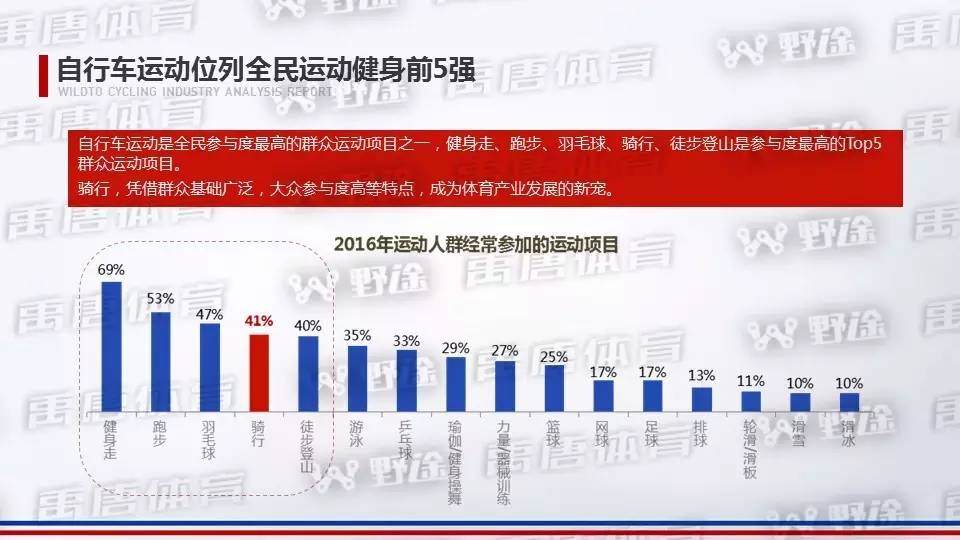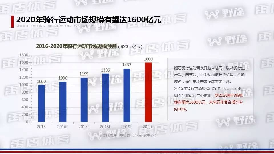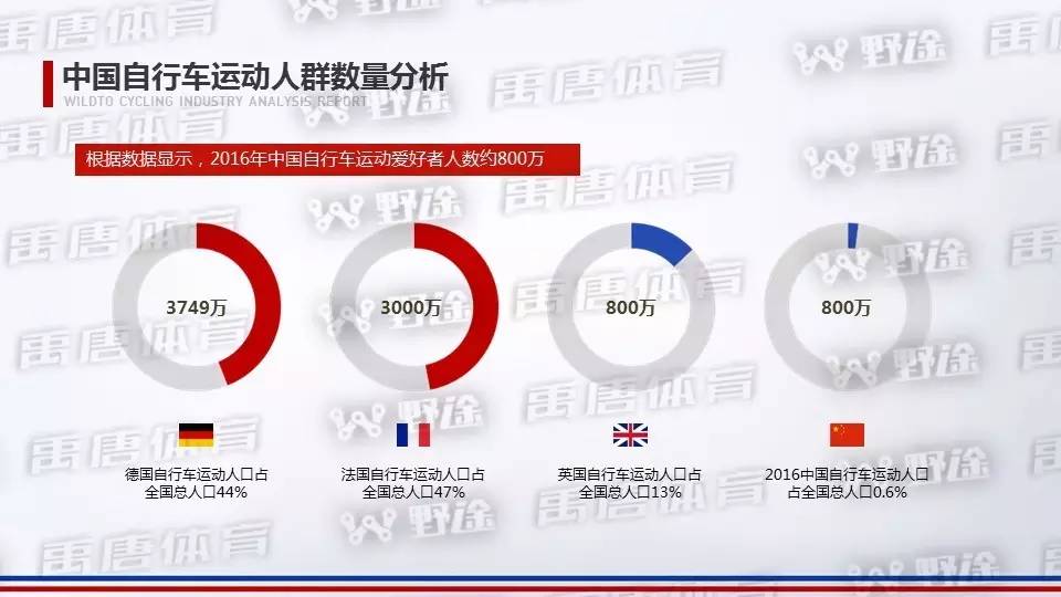 2016年中国自行车运动爱好者人数约800万,2025年,中国自行车运动人口将占总人口6%,达8400多万,10年增长幅度大约为14倍;中国自行车运动,还有极大的发展空间。