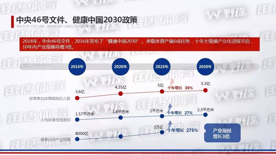 2014年,中央46号文件,2016年发布了“健康中国2030”。体育被列入国民幸福产业,全民运动健身成顶层国家战略,各省市强力落实。