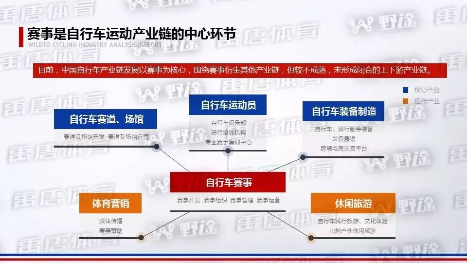 自行车赛事是产业发展的核心主线,目前国内已搭建较完备的赛事体系,但相比于发达国家,高等级赛事仍然非常少。中国自行车产业链发展以赛事为核心,围绕赛事衍生其他产业链,但较不成熟,未形成闭合的上下游产业链。
