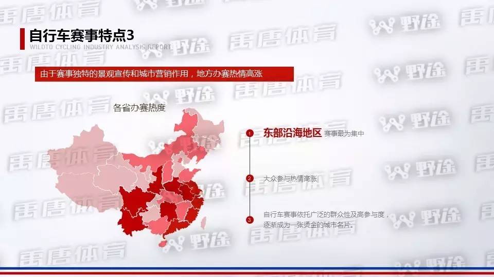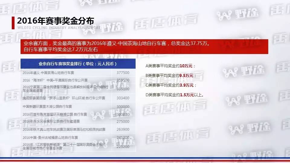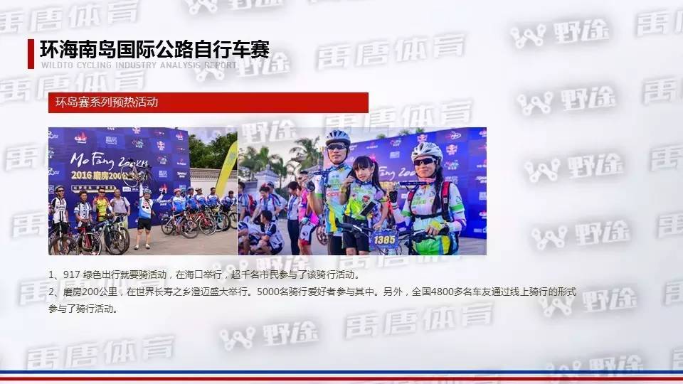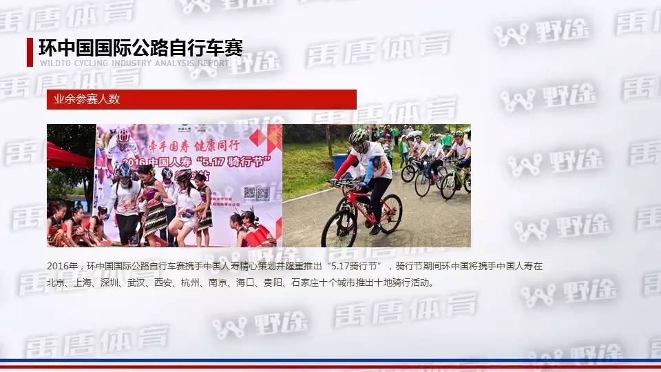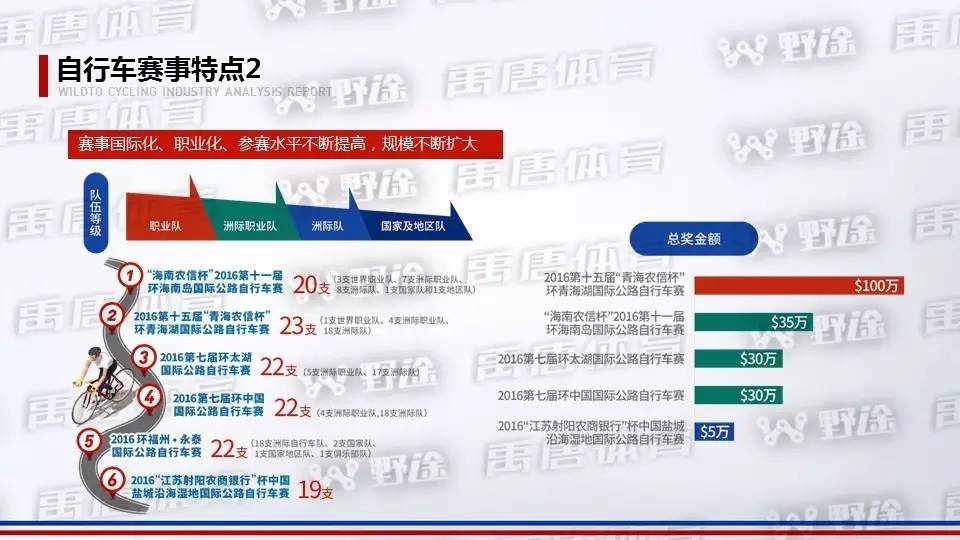 自行车赛事特点1:国际性赛事扎堆举办,业余赛事和群众赛事也出现“井喷”。业余自行车赛事、人群都出现不同程度的增长。