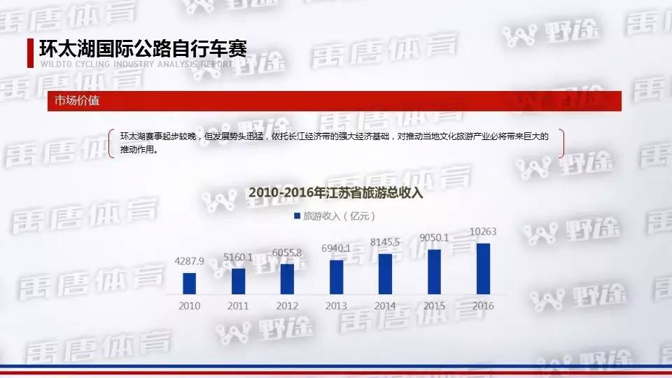 环太湖赛事起步较晚,但发展势头迅猛,依托长江经济带的强大经济基础,对推动当地文化旅游产业必将带来巨大的推动作用。