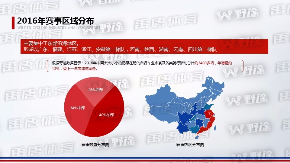 根据野途数据显示:2016年中国大大小小的记录在册的自行车业余赛及各类骑行活动总计约3400多场,年增幅约13%,较上一年度增速减缓。