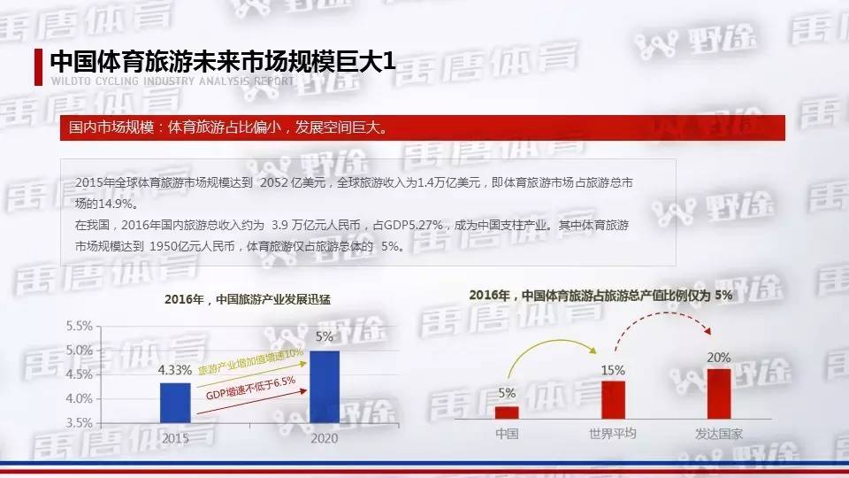 2016年国内旅游总收入约为 3.9 万亿元人民币,占GDP5.27%,成为中国支柱产业。其中体育旅游市场规模达到 1950亿元人民币,体育旅游仅占旅游总体的 5%。而美国等发达国家的体育旅游产值占到旅游产业的25%,我国体育旅游刚刚起步,未来有广阔增长空间。当下全球体育旅游产业均处于快速增长期,这也将带动我国体育旅游产业加速发展。