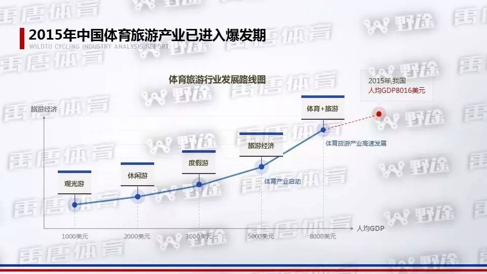 而根据相关研究,当人均GDP达到8000美元时,体育+旅游将迎来爆发期,而我国人均GDP在2015年就已突破8000万美元大关, 中国体育旅游产业已进入爆发期。根据国家旅游局、国家体育总局关于《大力发展体育旅游的指导意见》,到2020年,中国体育旅游总消费规模突破1万亿元。