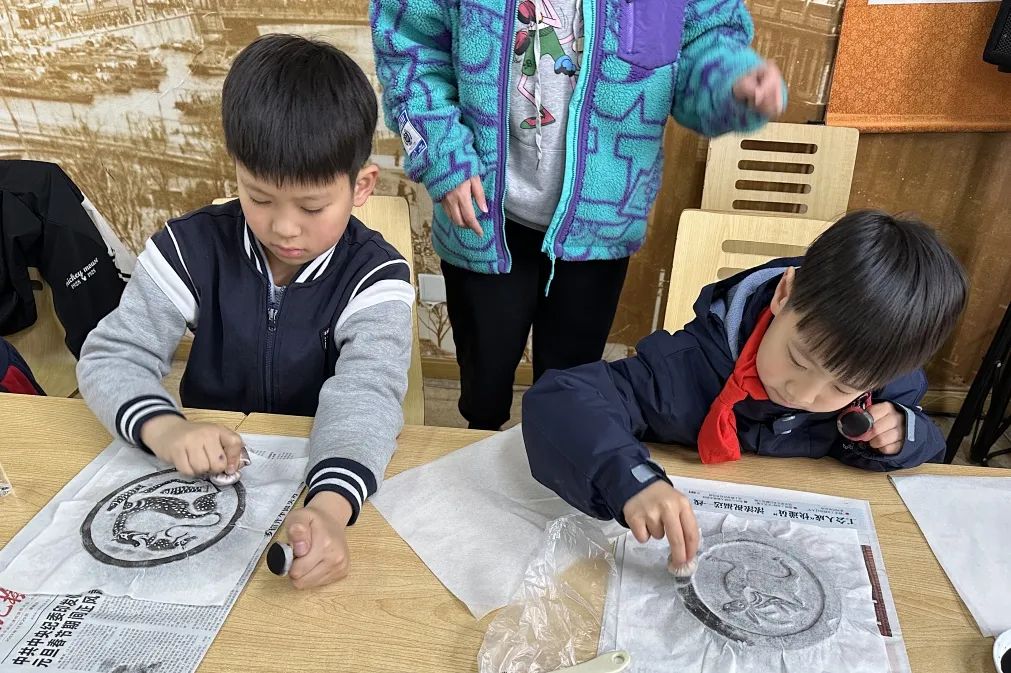 当第一幅“龙”主题纹样跃然纸上时,孩子们兴奋无比地举起了自己的作品。课程中,孩子们通过亲手制作一张张精美的拓片成品,享受了创作乐趣的同时,也深刻体会到了传统文化的魅力,对中国丰富的文化遗产有了更深入的认识和理解。