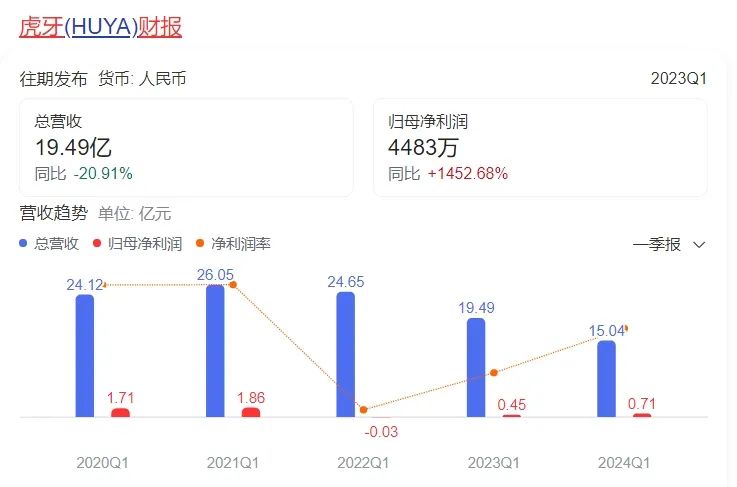 在新董事长林松涛上任前,虎牙2023年一季度的收入有19.49亿元。而来到2024年一季度,这个数字下降到了15亿元,下滑超过25%。