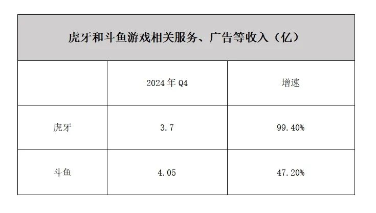 横向对比,斗鱼在四季度的创新业务、广告及其他收入同比增长47.2%至4.05亿元,比虎牙还要略高了些。