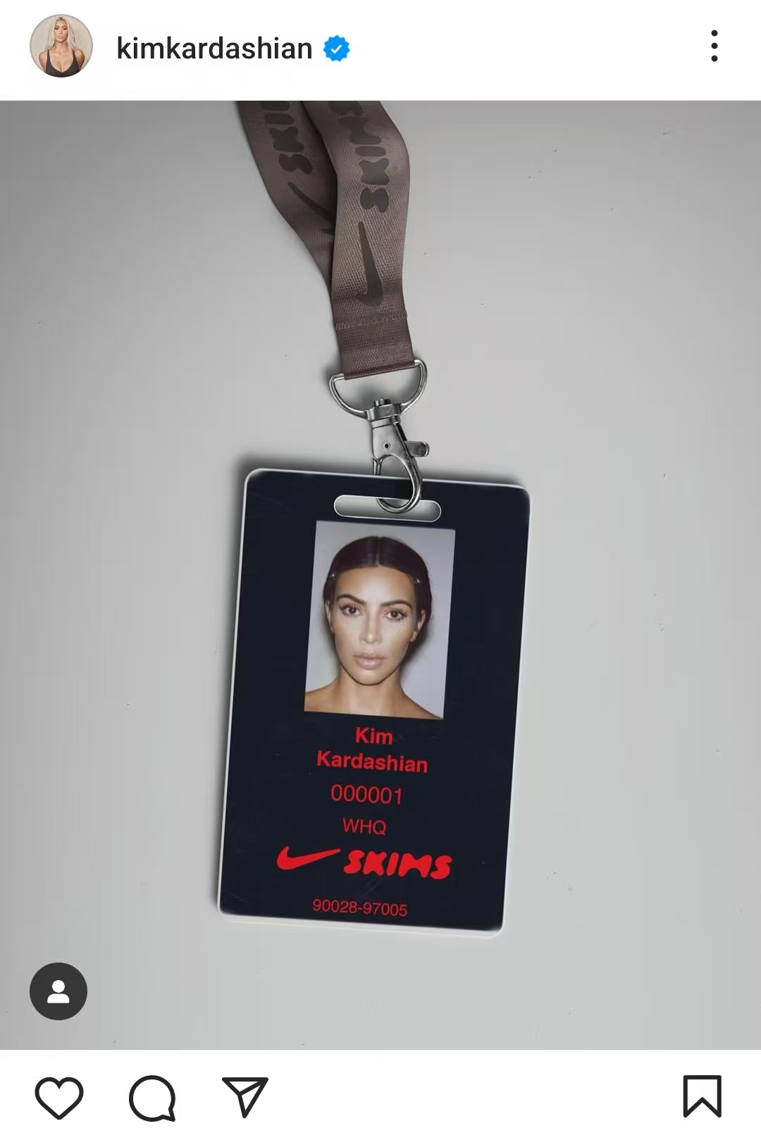 一个月前,卡戴珊也在ins上晒出编号000001的Nike工牌照。证件上Nike和卡戴珊个人品牌SKIMS的组合logo,官宣全新女性品牌NikeSKIMS的诞生。