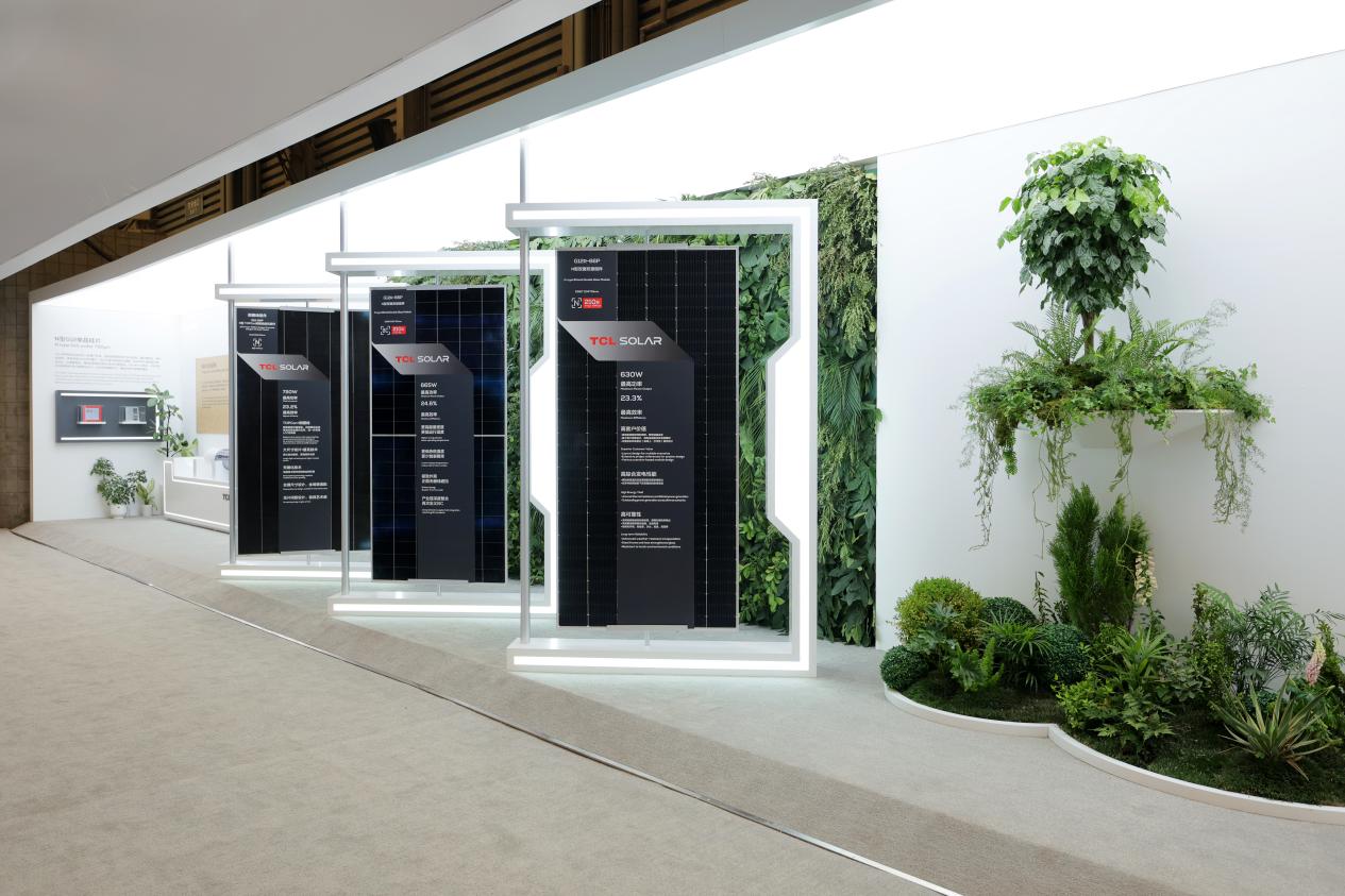 在新能源光伏领域,TCL中环重点展示了近期发布的新品G12R-66P BC光伏组件,其采用高效背接触太阳电池技术,最高功率达665W,最高效率突破24.6%,较同一尺寸下的TOPCon组件功率高30W,同等装机容量下使用面积减少6%以上,同等使用面积下装机量增加近7%。