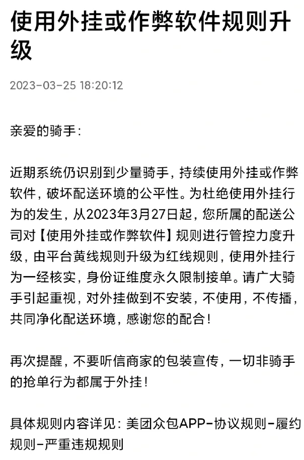 新识研究所发现,美团就外挂抢单事件做出过多次反作弊声明,只是第一次发现骑手用挂禁单一天,认定三次永久封。不过,不少骑手有侥幸心理,认为只要不是账号被永封,能多赚一天钱是一天。