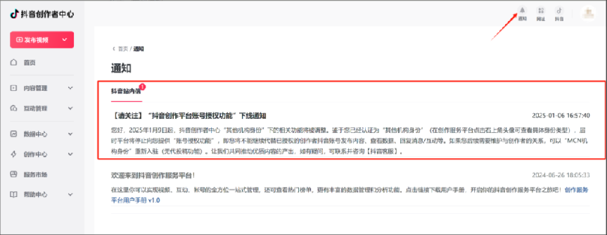 2025年1月6日,抖音就发布了“抖音创作平台账号授权功能”下线通知,其中最为关键的一项变动是机构号矩阵发布功能的下线。此后,除非开通MCN机构,否则将无法再使用此功能。