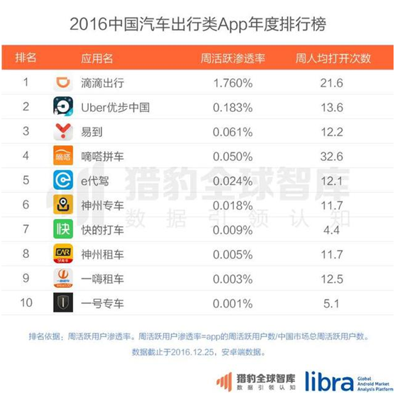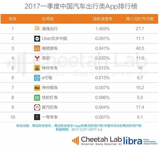 猎豹智库最新发布的《2017一季度中国汽车出行类app排行榜》显示,在app活跃渗透率方面,滴滴出行(1.469%)、Uber(0.091%)、嘀嗒拼车(0.041%)、易到(0.032%)和神州专车(0.013%)等位居前五位。而同样来自猎豹智库在今年1月份发布的《2016中国汽车出行类app排行榜》则显示,在app周活跃渗透率方面,滴滴出行(1.760%)、Uber(0.183%)、易到(0.061%)、嘀嗒拼车(0.050%)、e代驾(0.024%)等位居前五位。