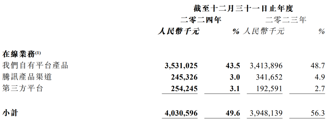 2024年,【在线业务】实现收入40.31亿元,同比增长2.1%,占总收入的比重由上年的56.3%降至49.6%。