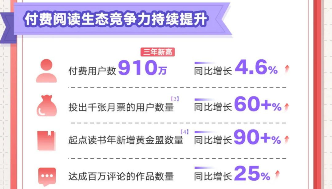 精品战略取得了一定的成效,2024年,阅文自有平台产品(如起点中文网、潇湘书院、QQ阅读等)收入35.31亿元,同比增长3.4%。这一年,阅文旗下的平台社区更加活跃,2024年投出千张月票的用户数量同比增长超60%。阅文集团CEO兼总裁侯晓楠在1月发布的内部信中还透露,2024年起点读书DAU创下新高,QQ阅读的会员收入同比增长40%。财报也显示,其平均月付费用户也达到910万,创造近三年的新高。