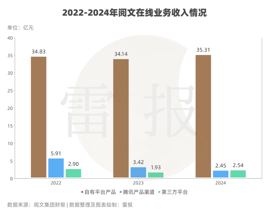 2022-2024年,阅文自有平台产品和腾讯产品自营渠道的累计平均月活分别为2.44亿、2.06亿、1.67亿,持续减少。其中,阅文自有平台产品的表现相对稳定,2022-2024年分别为1.10亿、1.05亿及1.04亿。而腾讯产品自营渠道的月活则迅速减少,2022年时仍有1.34亿,2023年为1.01亿,而到2024年则仅有6280万了,两年时间减少了7120万用户。