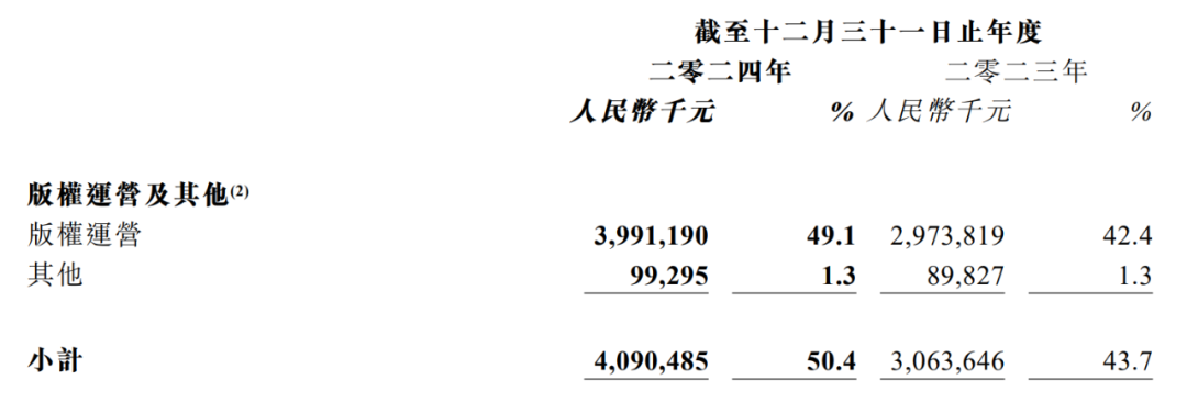 另一方面,【版权运营及其他】业务在 2024 年实现收入 40.90 亿元,同比增幅达 33.5%,在总收入中的占比提升至 50.4%,首次超过【在线业务】。这一增长主要得益于版权运营业务。2024 年,爆款影视动漫作品增多、IP 授权项目拓展,短剧与 IP 衍生品业务也不断发展,促使版权运营收入同比大幅增长34.2%,达到39.91亿元,较上一年净增10.18亿元,在总收入中的占比从42.4% 提升至49.1% 。
