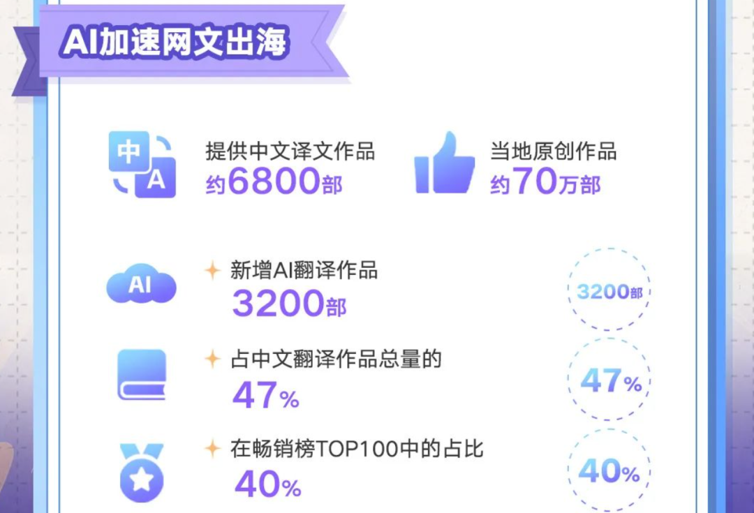 同时,AI也在加速阅文的IP全球化进程。2024年,海外阅读平台WebNovel新增AI翻译作品3200多部,占中文翻译作品总量的47%,在畅销榜Top 100中的占比约40%。AI让WebNovel覆盖的语种更加丰富,包括西班牙语、葡萄牙语、德语、法语、印尼语、日语等,2024年AI翻译的非英语作品收入增长超过350%。截至2024年12月31日,WebNovel向海外用户提供约6800部中文翻译作品和约70万部当地原创作品。