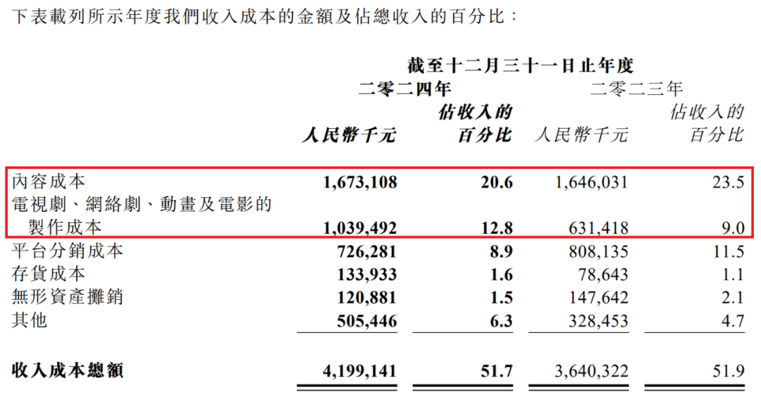 此外,在收入大增11亿的情况下,非IFRS净利润也仅仅是与上一年度基本持平。从财报数据来看,这主要是由于IP可视化的制作成本(10.39亿元)以及为推广宣传相关影视作品的销售及营销开支(22.61亿元)增加所致。2023年时两者的金额分别为6.31亿元及17.20亿元,合计增加了9.49亿元之多。