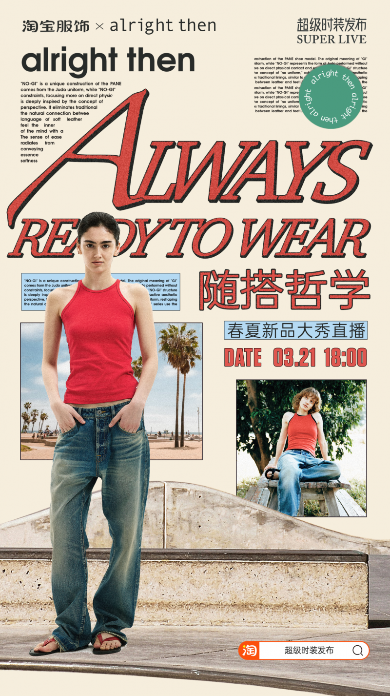 今晚18:00,淘宝「超级时装发布」将携手alright then,以「随搭哲学」为主题,带来一场加州街头电影即视感的美式复古风时尚秀场直播,开启春夏新品上新。