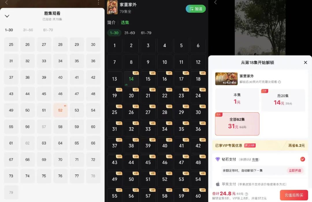 “独家首发”还得加免费定语,是因为爱奇艺和腾讯视频也上架了这部短剧。只不过爱奇艺的收看方式为13集后订阅会员专享,腾讯视频则是从能免费看前17集,剩下62集VIP会员能用24.8元购买,非会员购入价则是31元。