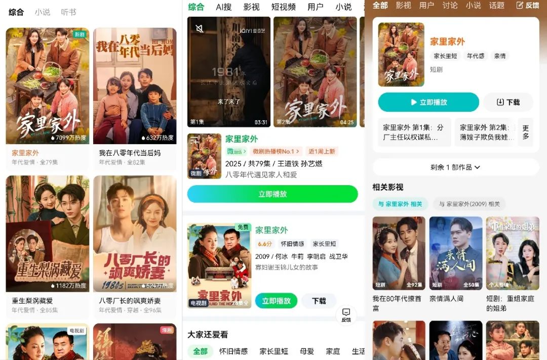 而在到这次《家里家外》,实现“长短共吃”的局面。表面上看,《家里家外》多平台上线似乎预示着爱奇艺与红果短剧的“和解”,但实际情况可能更为复杂。