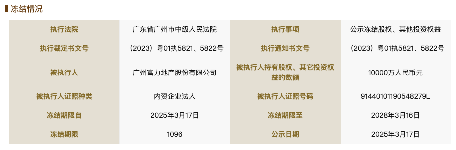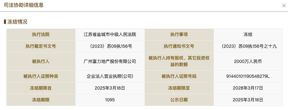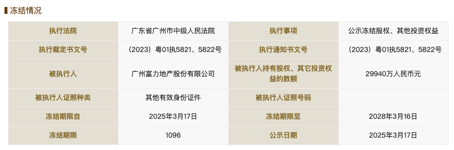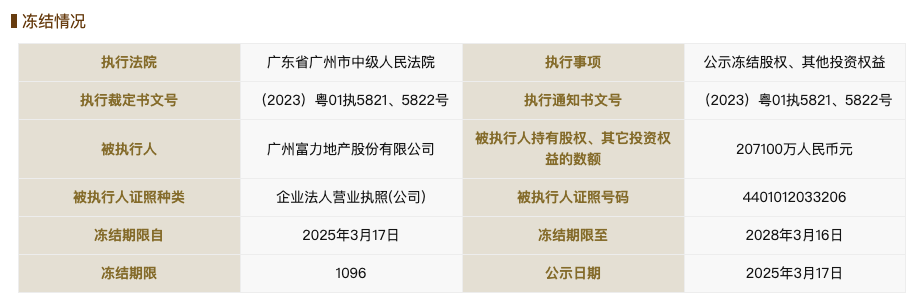 国家企业信用信息公示系统网站显示,近日,富力地产(HK.02777)新增4条股权冻结信息,股权所在企业分别为江西富力房地产开发有限公司、海南那甲旅业开发有限公司、海南鼎富投资控股有限公司、海南富力房地产开发集团有限公司,冻结股权数额合计24.9亿余元,冻结期限均为三年,执行法院为广东省广州市中级人民法院、江苏省盐城市中级人民法院。