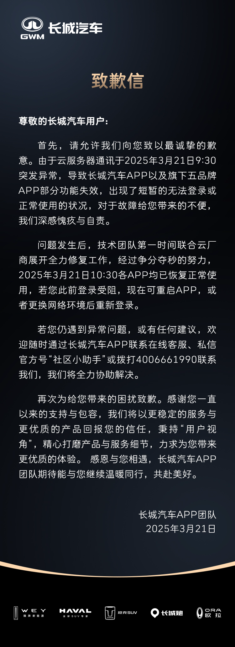 3月21日下午,长城汽车APP团队发布致歉信:由于云服务器通讯于2025年3月21日9:30突发异常,导致长城汽车App以及旗下五品牌App部分功能失效,出现了短暂的无法登录或正常使用的状况。问题发生后,技术团队第一时间联合云厂商展开修复工作,2025年3月21日10:30各App均已恢复正常使用。