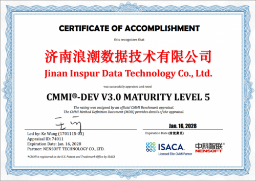 近日,CMMI研究院官方网站正式公告,浪潮云海顺利通过CMMI V3.0 五级评估认证,荣获CMMI 5级证书。标志着浪潮云海在软件研发能力和项目管理水平上持续保持国际先进水平,是软件研发和服务交付标准化、规范化的重要里程碑。
