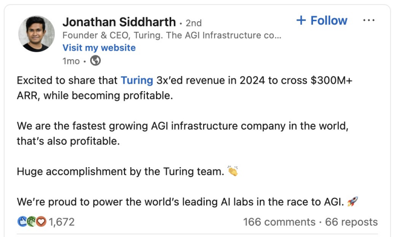 业绩方面,Turing创始人兼CEO Jonathan Siddharth 在社交平台高调宣布:公司2024年收入增长3倍,ARR(年度经常性收入)突破3亿美元,并成为“全球增长最快且盈利的AGI基础设施公司”。