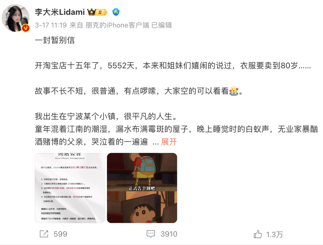 “开淘宝店十五年了,5552天,本来和姐妹们嬉闹的说过,衣服要卖到80岁……”3月17日,淘宝店主兼网红时尚博主“李大米Lidami”对外发布闭店公告,称3月17日正式闭店,3月29日、3月30日两晚在淘宝直播清仓。