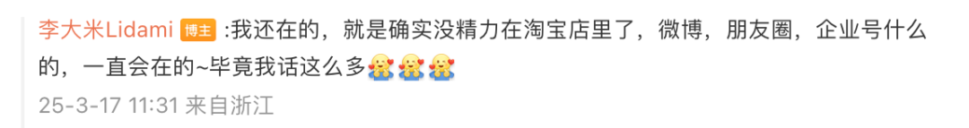 对她的闭店决定,网友猜测纷纷。不过,“李大米Lidami”亦两次在闭店回复评论中强调:闭店的是淘宝,其他平台她都还一直在。