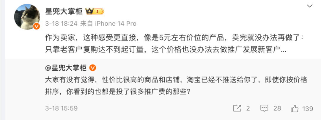 从消费侧来看,因为商家不赚钱,也无法满足用户需求。3月18日,认证博主“星兜大掌柜”就说,性价比很高的商品和店铺,淘宝已经不再推送。“作为卖家,感受更直接,像是5元左右价位的产品,卖完就没法做了:老客户复购达不到起订量,价格也没法做推广发展新客户。”