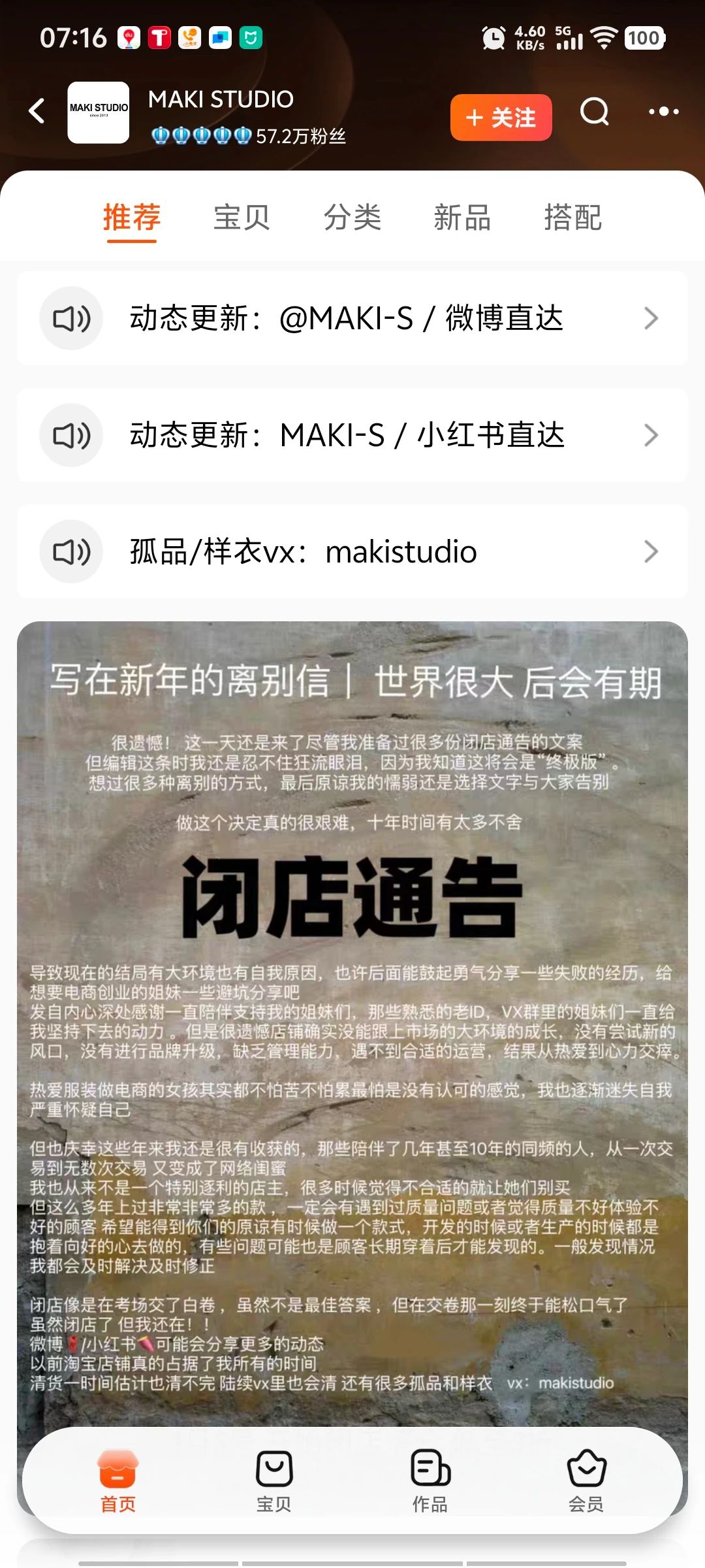 “李大米Lidami”之外,“We Margiela”、“Ff5 official”、12年老店“井上梧桐”、“可宋WANAN”等大批淘宝店铺……以及淘宝粉丝超57万的红人店“MAKI STUDIO”也发出了千字闭店通告,明确表示“淘宝店占据太多时间,没有尝试新的风口,没能跟上市场大环境成长”,简单来说就是生意没有增长,甚至下滑,是闭店主要原因。