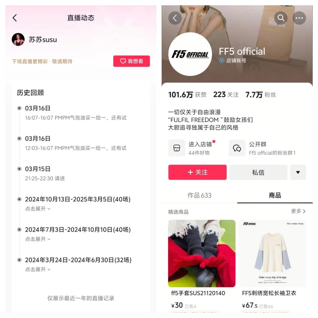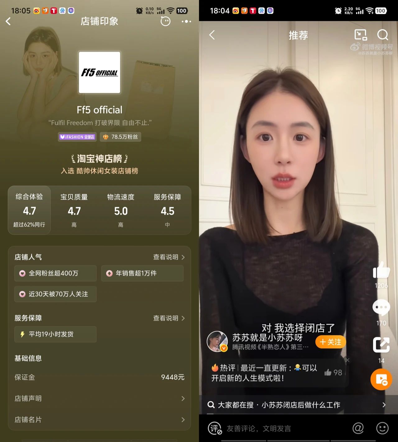 关店前,“Ff5 official”的淘宝店铺拥有78.5万粉丝,其主理人为“苏苏SUSU”,曾是《半熟恋人》第三季嘉宾,各大平台累计粉丝超1500万,其中抖音1102万,微博267万,是拥有不小粉丝群体的网红达人。