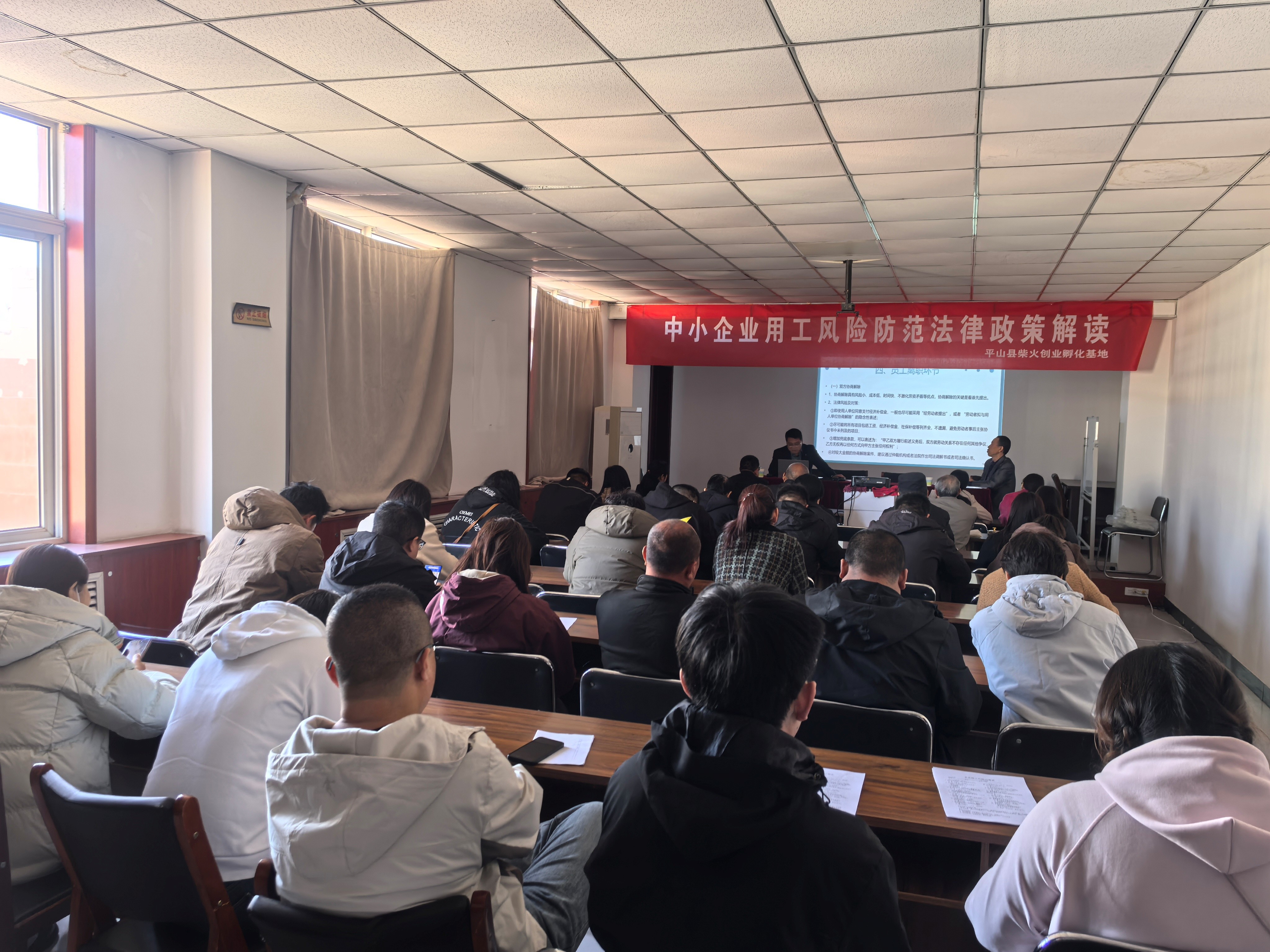 为助力在孵企业规范用工管理、规避法律风险,切实帮助在孵企业提升用工管理水平,促进企业合规稳健发展,平山县柴火创业孵化基地携手石家庄殷发信息咨询服务有限公司于3月19日在基地多功能会议室成功举办了"中小企业用工风险防范法律政策解读"专题活动。本次活动特邀资深专家赵永辉、杨军国律师,为基地内四十余家创业实体代表及管理团队带来了一场兼具专业性与实用性的法律政策盛宴,现场反响热烈,获得一致好评。