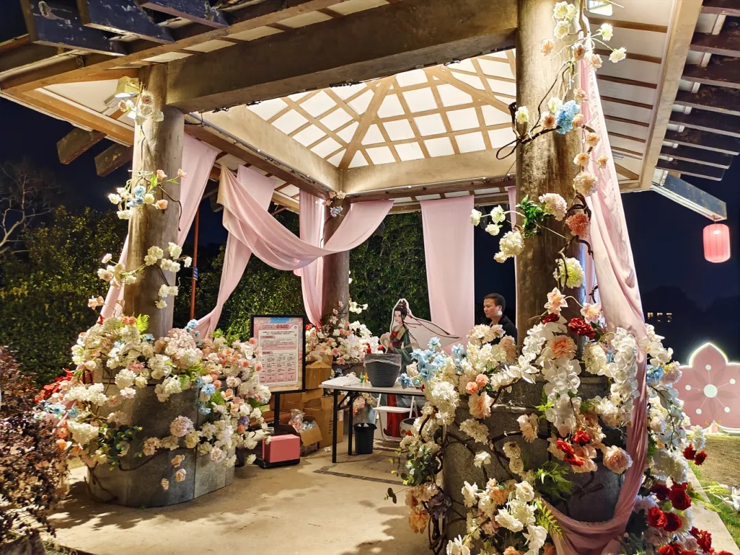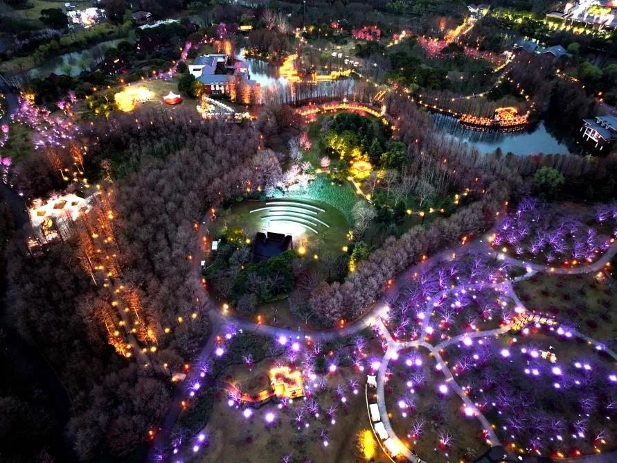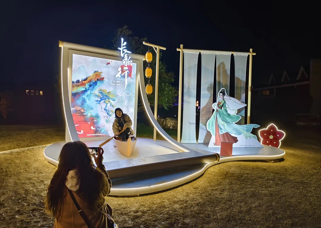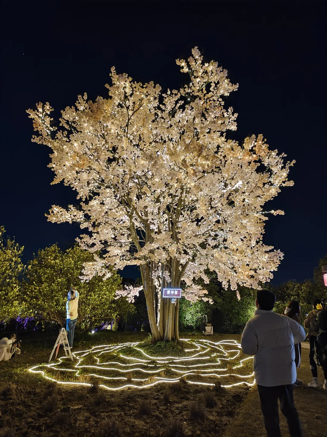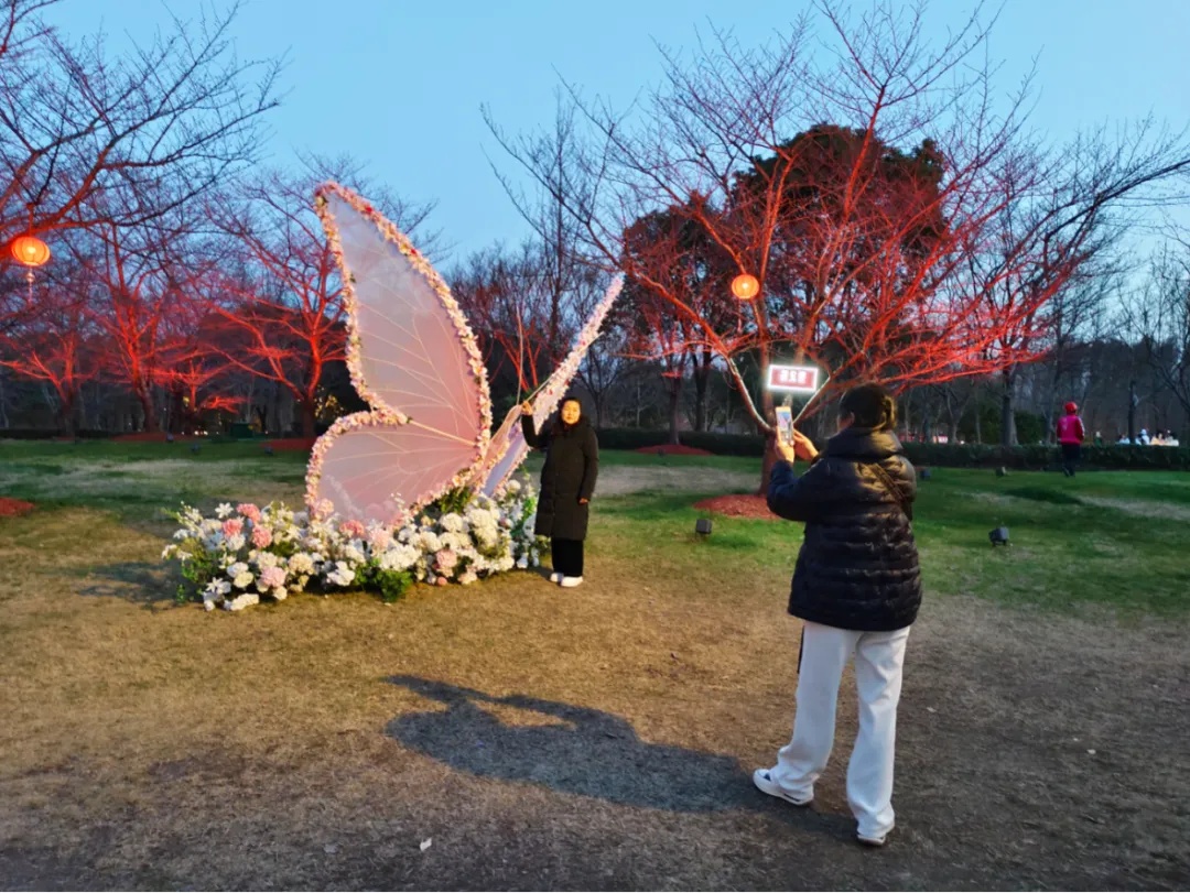 五大打卡点,个个都出片。游客可以在“蝶之影”与蝶影共飞,在“樱神树”接收花神祝福,在藤蔓秋千步入仙境起舞,在樱花亭感受小调呦呦,在曲桥看百盏花灯共明。其中,高约8米的“樱神树”格外引人注目。整棵“樱树”以白色和淡粉色的仿真花打造,配上暖色灯光,在夜幕下格外唯美浪漫,成为最受游客欢迎的拍照打卡点之一。