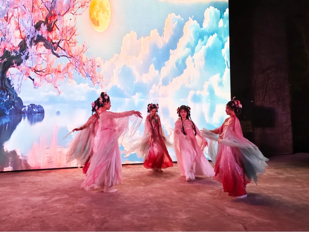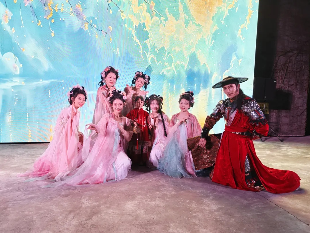 其中,樱花光影秀作为重头戏,每晚6点至9点半循环上演,每场15分钟,游客可以随时观看。除了光影秀,还有“大唐电音”音乐表演、国风舞蹈表演“蝴蝶舞”,以及NPC巡游、汉服花灯夜游等活动每日轮番上演。主办方特别邀请了众多B站UP主进行舞蹈表演,以及大量NPC驻点与游客互动打卡。樱花岛项目宣传负责人介绍道,“我们会在双休日加入更多更具特色的大型活动,如漫展、coser互动、‘锦绣神州’汉服比赛等。每周双休日的活动都会有所不同。”
