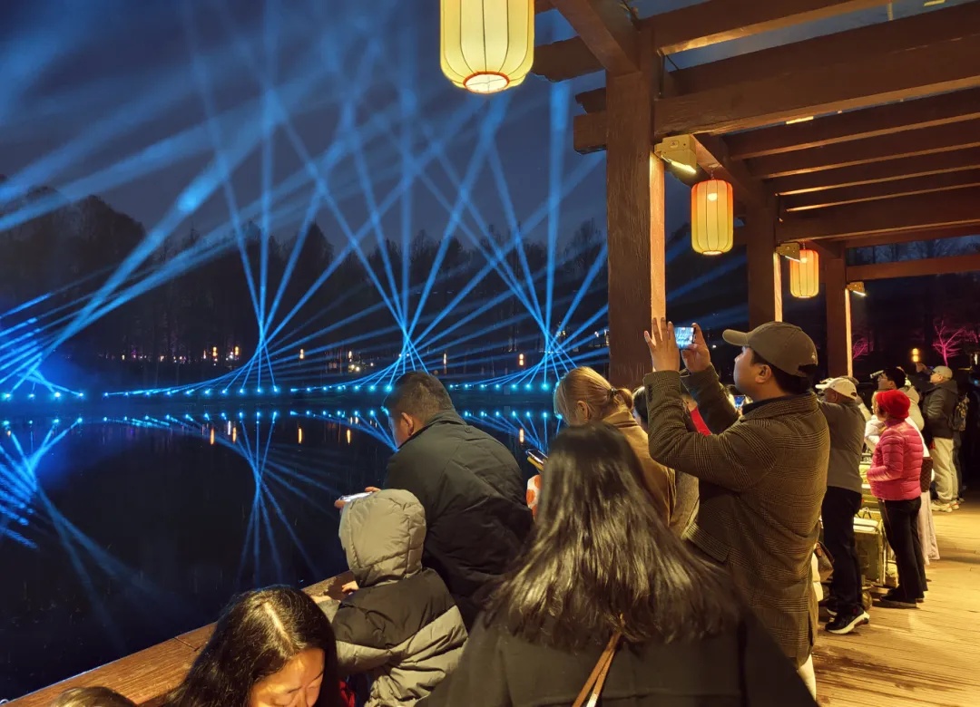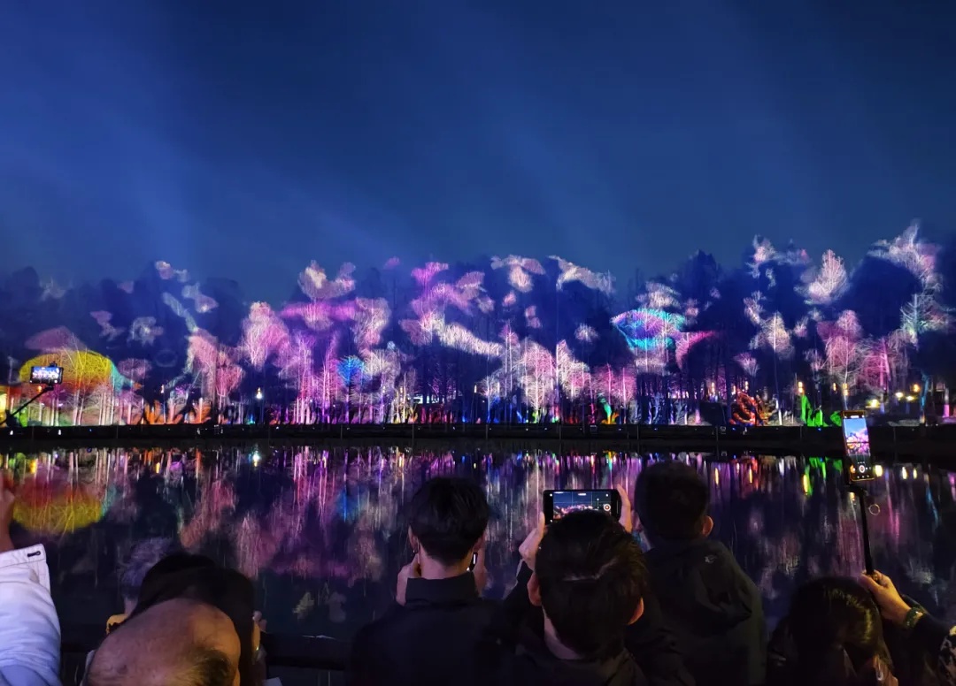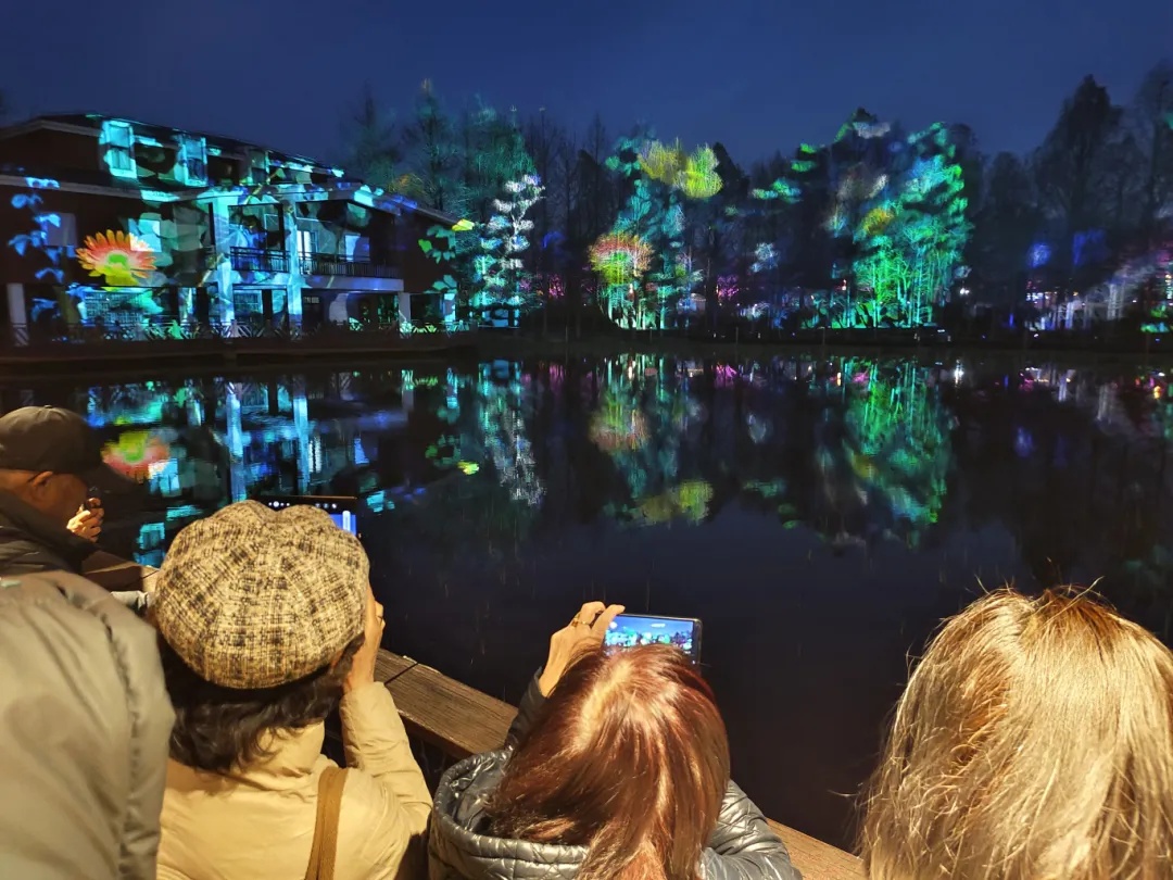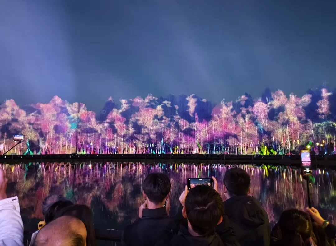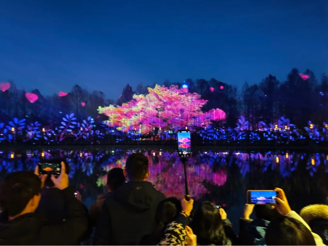 夜晚的樱花岛,化身为光影交织的梦幻世界。一场以“蝶恋樱”为主题的光影秀正在上演。樱花绽放、灵蝶翩跹、水上仙境、麋鹿穿梭……现场利用湖面倒影和环绕式杉树林,通过激光、雾森呈现出彩色光影交织,让观者仿佛置身于瑰丽的梦境。游客们纷纷驻足,举起手机,记录下这如梦如幻的瞬间。