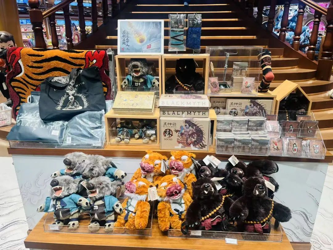 开业当天,门店首发黑神话官方衍生品专区,涵盖毛绒、徽章、袜子、配饰等丰富的SKU,以及IP红包、春联等联名赠品周边,店内通往二楼楼梯的显示屏上,至今还在循环播放游戏里的经典场景。