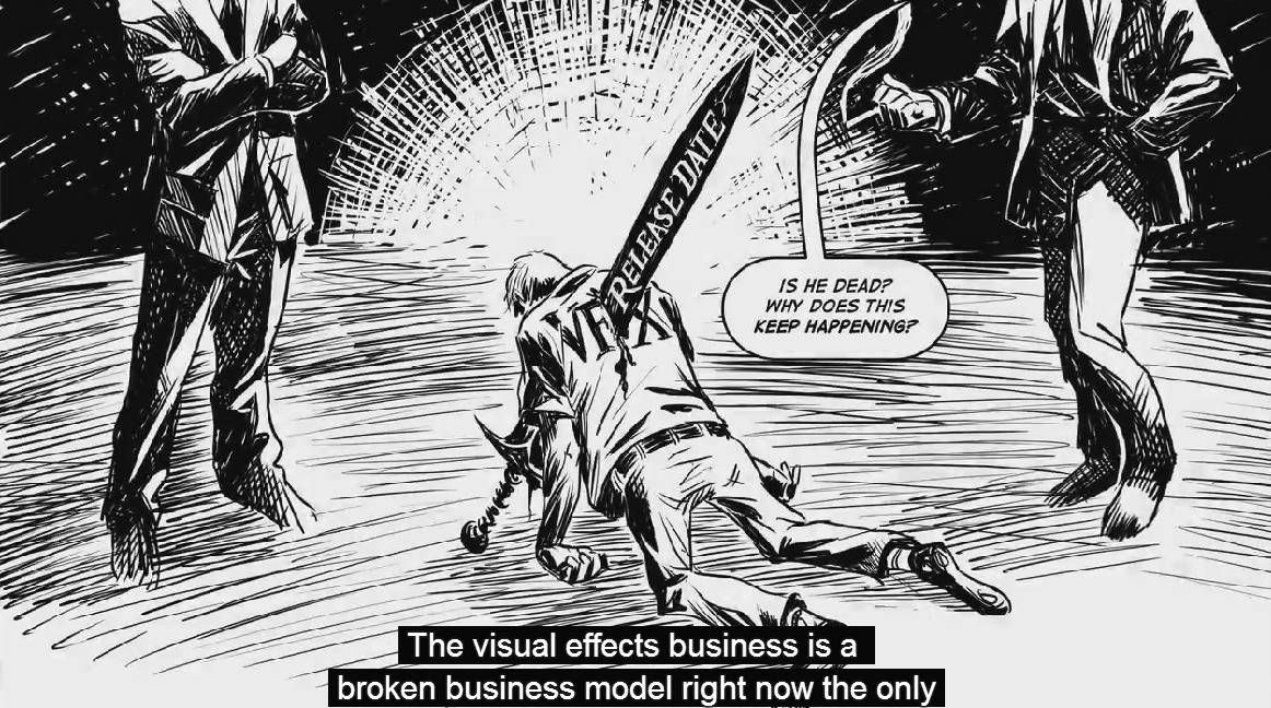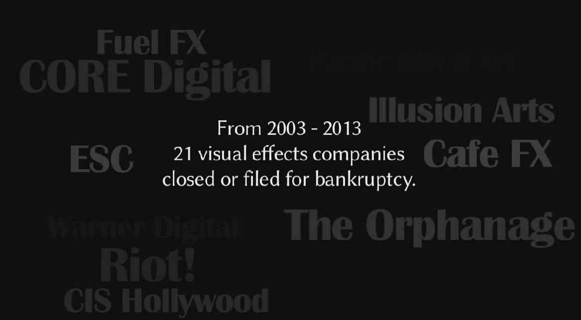 全世界有21间著名的大型特效公司关门或倒闭,但是这段期间最赚钱的50部影片,却有49部和电脑特效息息相关,而且电影的整体票房更是随著特效进步逐年成长,现在几乎已经没有卖座电影不用到大量特效,但是,电影的营收成长却和特效公司的收入脱钩,特效产业的商业模式变得很糟糕。而且大家都忘了製作特效的不是电脑,而是电脑背后的许多艺术家,投入大量时间,追逐自我实现以及客户要求的完美。