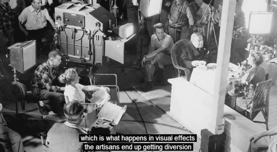 电影公司绝不可能允许导演一个搭景拍了一、两周的戏之后,突然说要整个拆掉重搭一个新的,然后再拍两周,绝不可能!因为现场工作人员都是拿时薪的,拍愈久就烧愈多钱,这对电影公司来说会是很沉重的负担。所以电影拍片现场的工作节奏都非常紧凑,导演也会很专注,因为所有人都在等他下指令,所有人都必须在有限时间内挤出最棒的创意成果。这个道理其实在电脑特效也应该是一样的,但今天只因为做决定的那些人(导演、片商)不必在现场,一切就变了调。