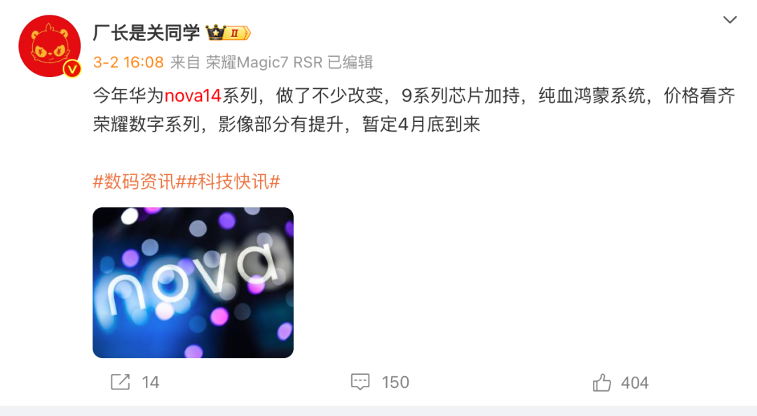 其实华为也意识到了上述问题,接下来将针对性地推进直板手机适配纯血鸿蒙系统。2025年3月初,数码博主“厂长是关同学”爆料称,华为nova14系列手机将搭载纯血鸿蒙系统,暂定四月底问世。