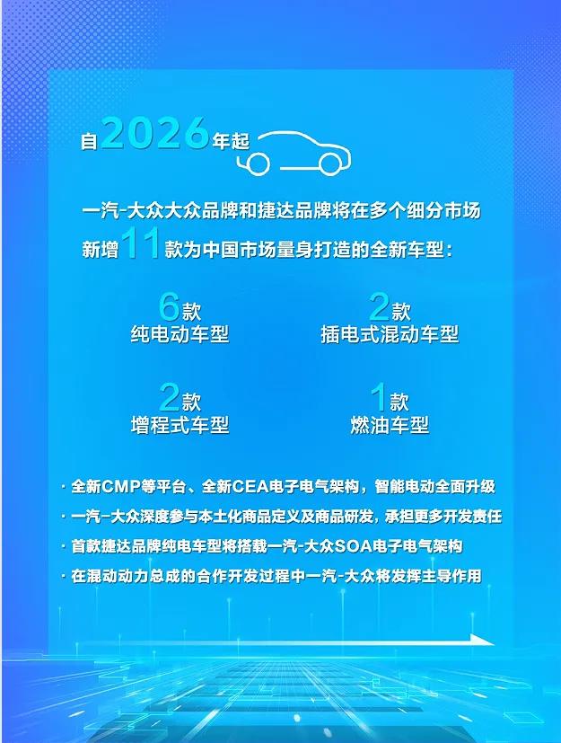 3月23日,大众汽车集团与中国一汽签署战略合作协议,宣布2026年起推出一汽-大众11款为中国市场量身打造的全新车型。其中,捷达品牌的首款纯电动车型将于明年上市。