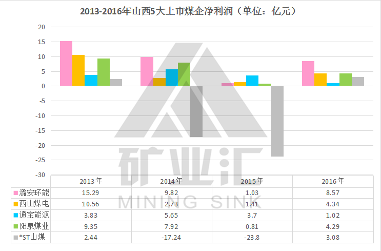 西山煤电和阳泉煤业表现不俗,分别以4.34亿元、4.29亿元的净利润位列第二、第三名,同比增长2.1倍和4.3倍。而山煤国际(*ST山煤)2016年扭亏为盈,净利润为3.08亿元。